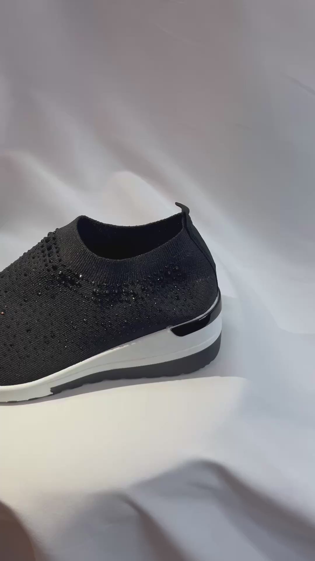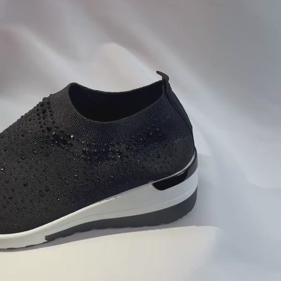 Step into modern comfort with these sophisticated slip-on sneakers featuring an innovative knit design. The black breathable mesh upper is adorned with eye-catching crystal embellishments that add a touch of sparkle to every step. The sock-like construction offers a snug, second-skin fit while providing excellent flexibility. A contrasting white platform sole provides stable support and adds a contemporary edge to the design. Perfect for casual outings or dressy casual occasions, these versatile sneakers combine athletic comfort with fashion-forward style.