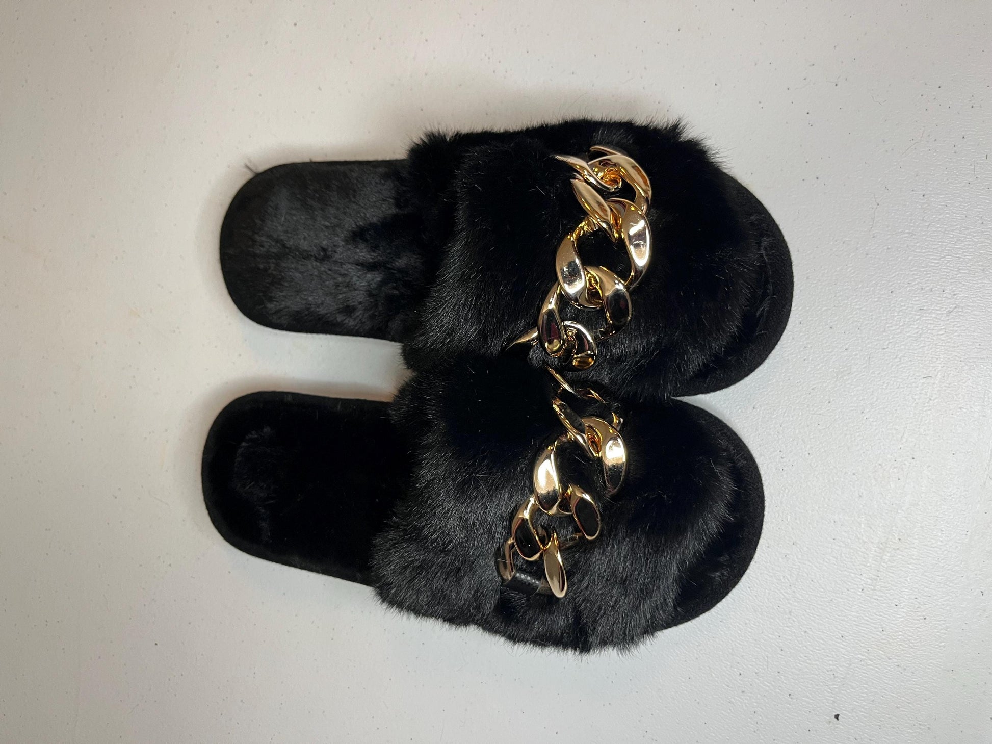 Step into luxurious comfort with these glamorous faux fur slide slippers. The plush faux fur upper provides a soft, cushioned feel against your feet, while the striking gold chain detail adds an elegant touch of luxury. The black velvet base offers durability and support for indoor wear. These slip-on style slippers feature a classic open-toe design that makes them easy to slide into when you're ready to unwind. Perfect for lounging at home while maintaining a fashionable appearance, these slippers bring together comfort and sophistication. The versatile design suits various indoor settings, from casual mornings to relaxed evenings. Ideal for year-round use, these slippers make an excellent addition to your at-home footwear collection or a thoughtful gift for someone who appreciates both comfort and style.