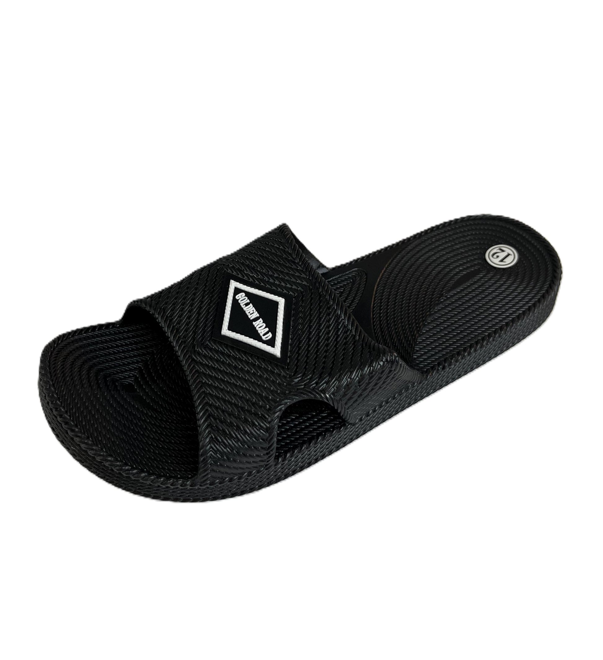 Step into ultimate comfort with these Golden Road slides featuring a distinctive textured cross-band design. The wide, woven-texture strap provides excellent support while maintaining a stylish appearance with the signature Golden Road diamond logo emblem. Available in classic black and navy options, these slides are perfect for casual wear, post-workout recovery, or lounging.