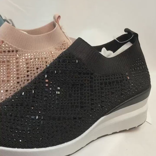 Step into stylish comfort with these Rhinestone Wedge Sneakers – the perfect mix of fashion and function! Designed for women who love sparkle without sacrificing comfort, these slip-on platform sneakers feature a lightweight wedge sole, breathable knit fabric, and dazzling rhinestones to elevate any outfit.