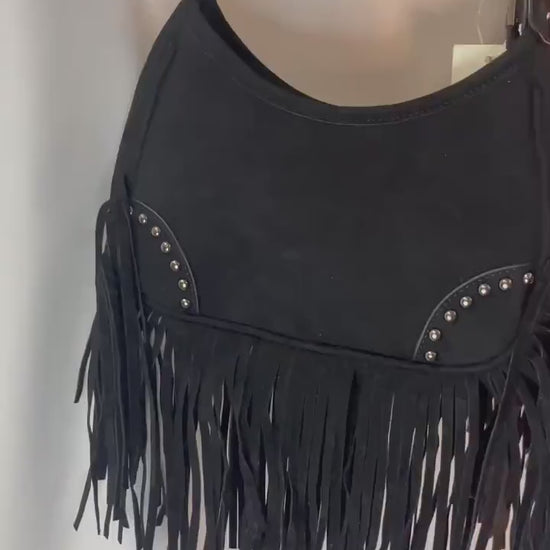 Western Fringe Suede Shoulder Bag | Black & Brown Studded Boho Purse | Cowgirl Festival Crossbody | Bohemian Hobo Bag | Rodeo Outfit