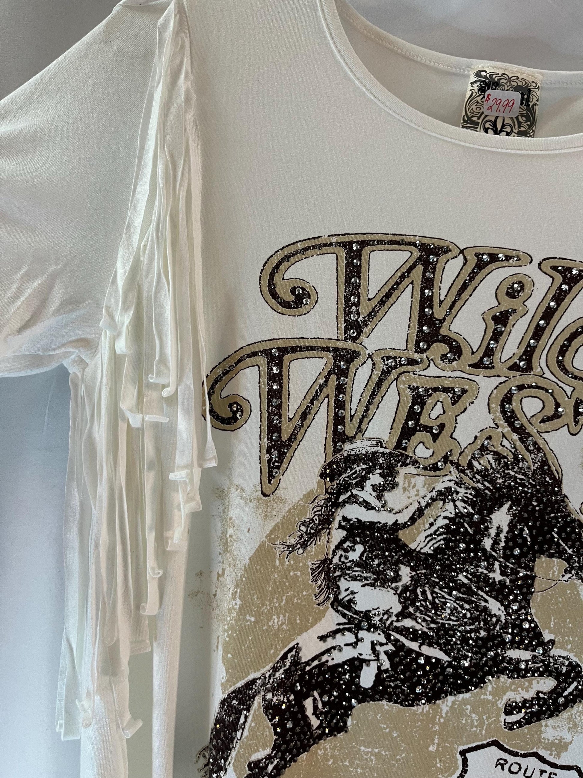 This vintage-inspired Route 66 graphic tee features bold "Wild West" lettering, a studded horse and rider graphic, and dramatic fringe sleeves for a true cowgirl flair. Whether you're heading to a country concert, rodeo, or just channeling your inner western goddess, this top will make a statement.